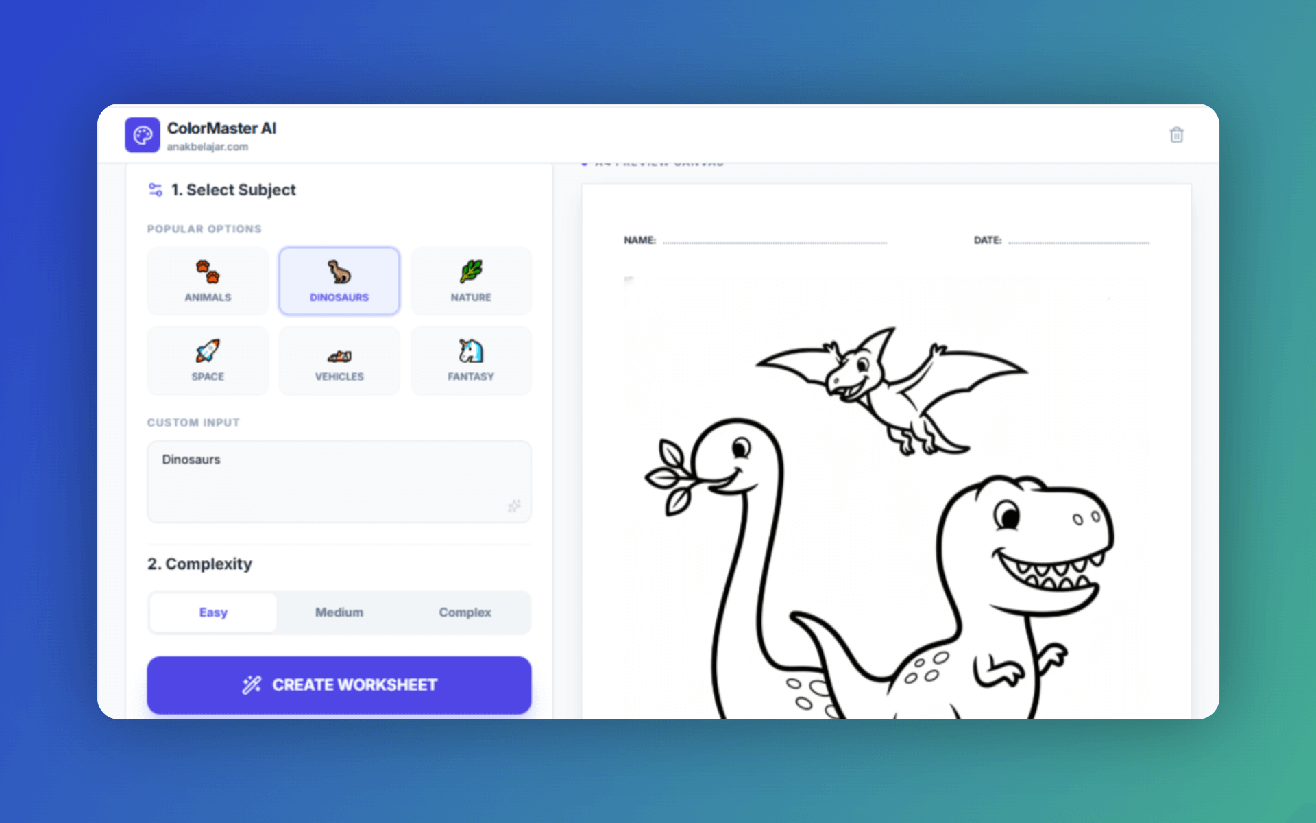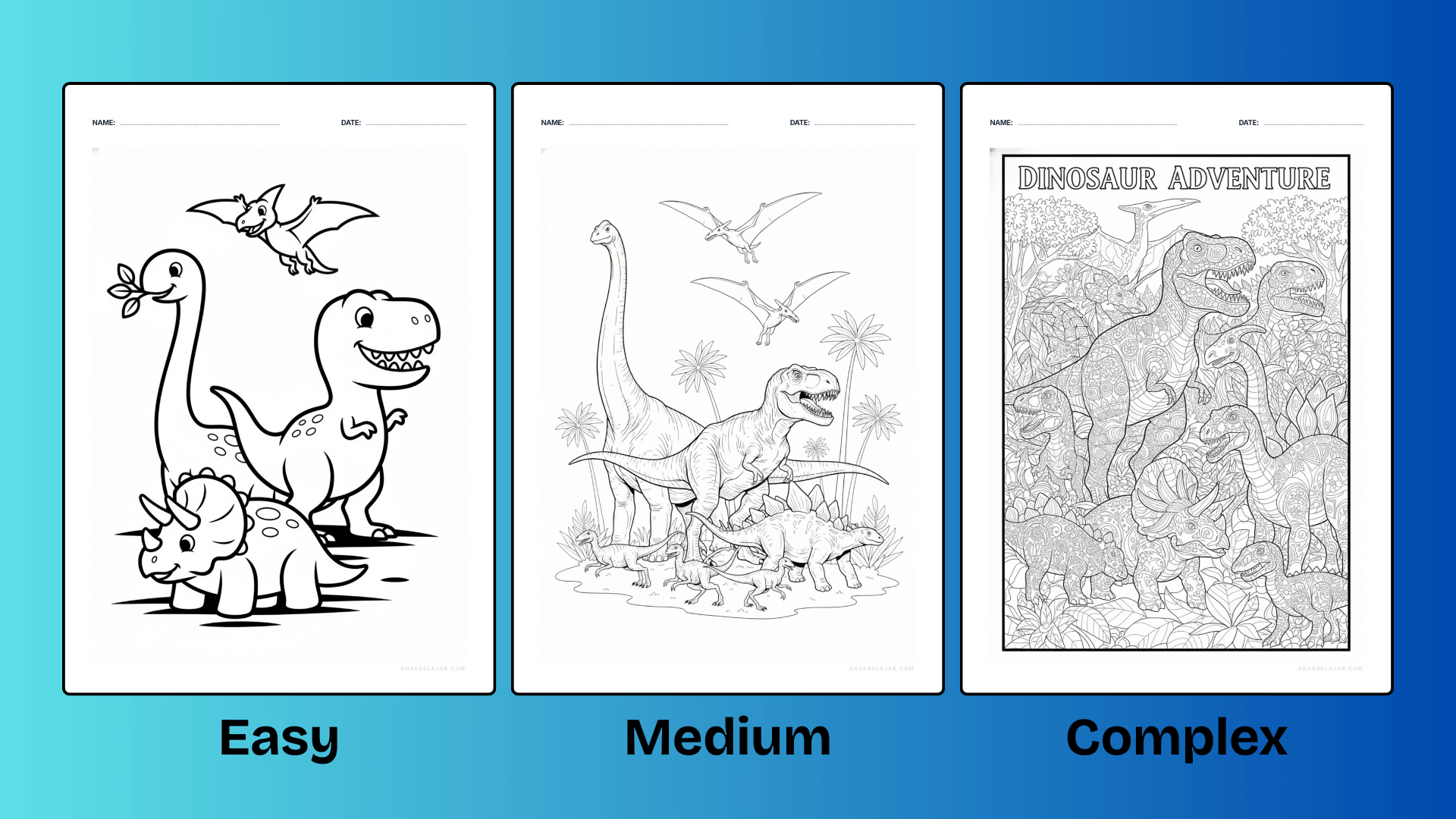 Tahap Easy sesuai untuk kanak-kanak kecil dengan reka bentuk ringkas, Tahap Medium menawarkan lebih perincian untuk pengguna yang sudah biasa mewarna manakala Tahap Complex menyediakan corak kompleks untuk remaja dan dewasa yang mahukan cabaran serta fokus.