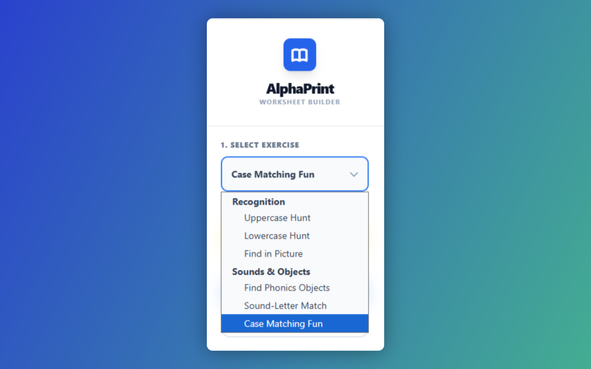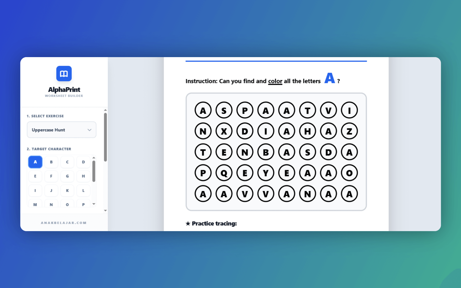 'Alphabets Exercise Worksheet Generator' ialah sebuah aplikasi web pendidikan yang direka khusus untuk membantu guru, ibu bapa, dan pendidik menyediakan worksheet latihan abjad dengan cepat dan sistematik.