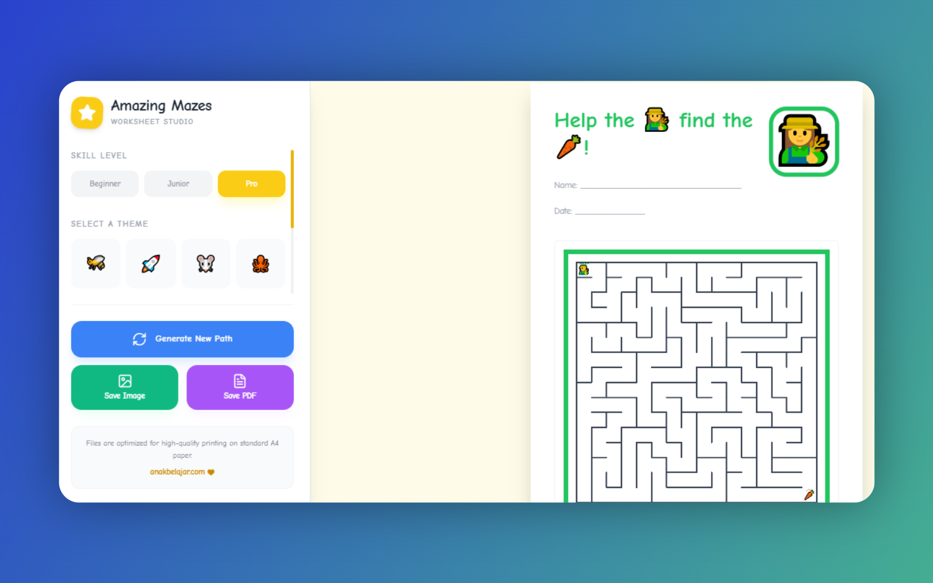 'Maze Worksheet Maker' ialah sebuah web app ringkas yang direka untuk menghasilkan worksheet kerja maze secara automatik. Aplikasi ini membantu ibu bapa dan guru menyediakan aktiviti yang menyeronokkan tetapi masih mempunyai tujuan pembelajaran yang jelas.