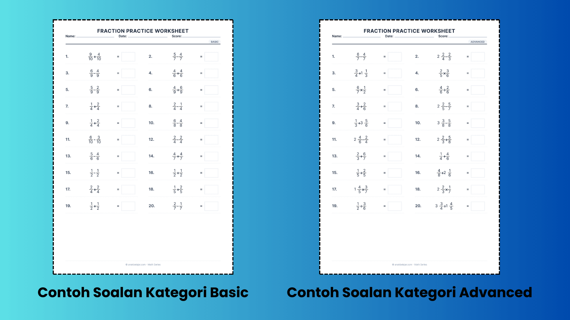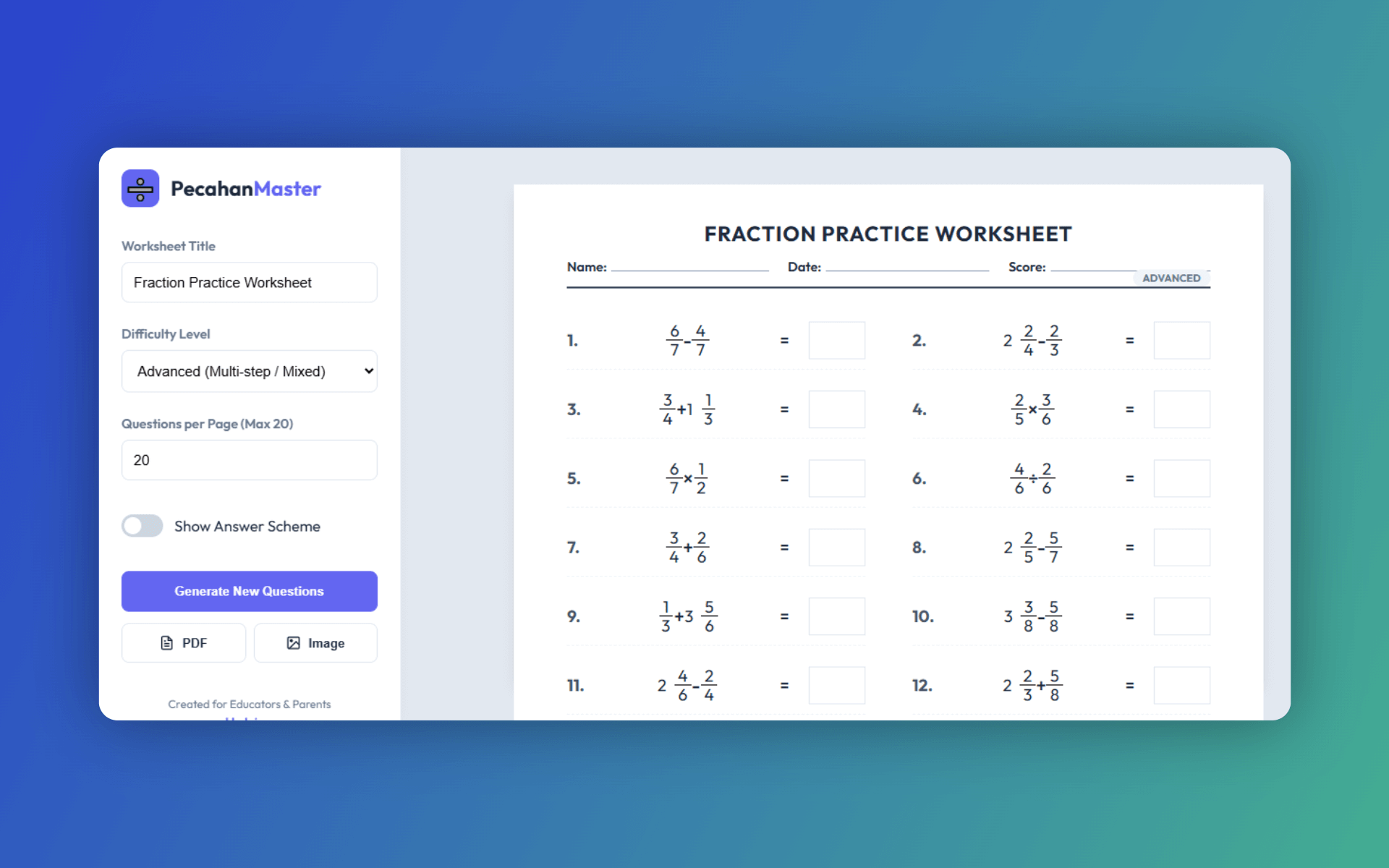 Matematik Fraction Worksheet Generator ialah web app yang digunakan untuk membuat worksheet matematik yang fokus pada topik pecahan. Ia membantu guru, ibu bapa, dan pelajar menyediakan soalan pecahan dengan cepat tanpa perlu membina soalan secara manual dari awal.