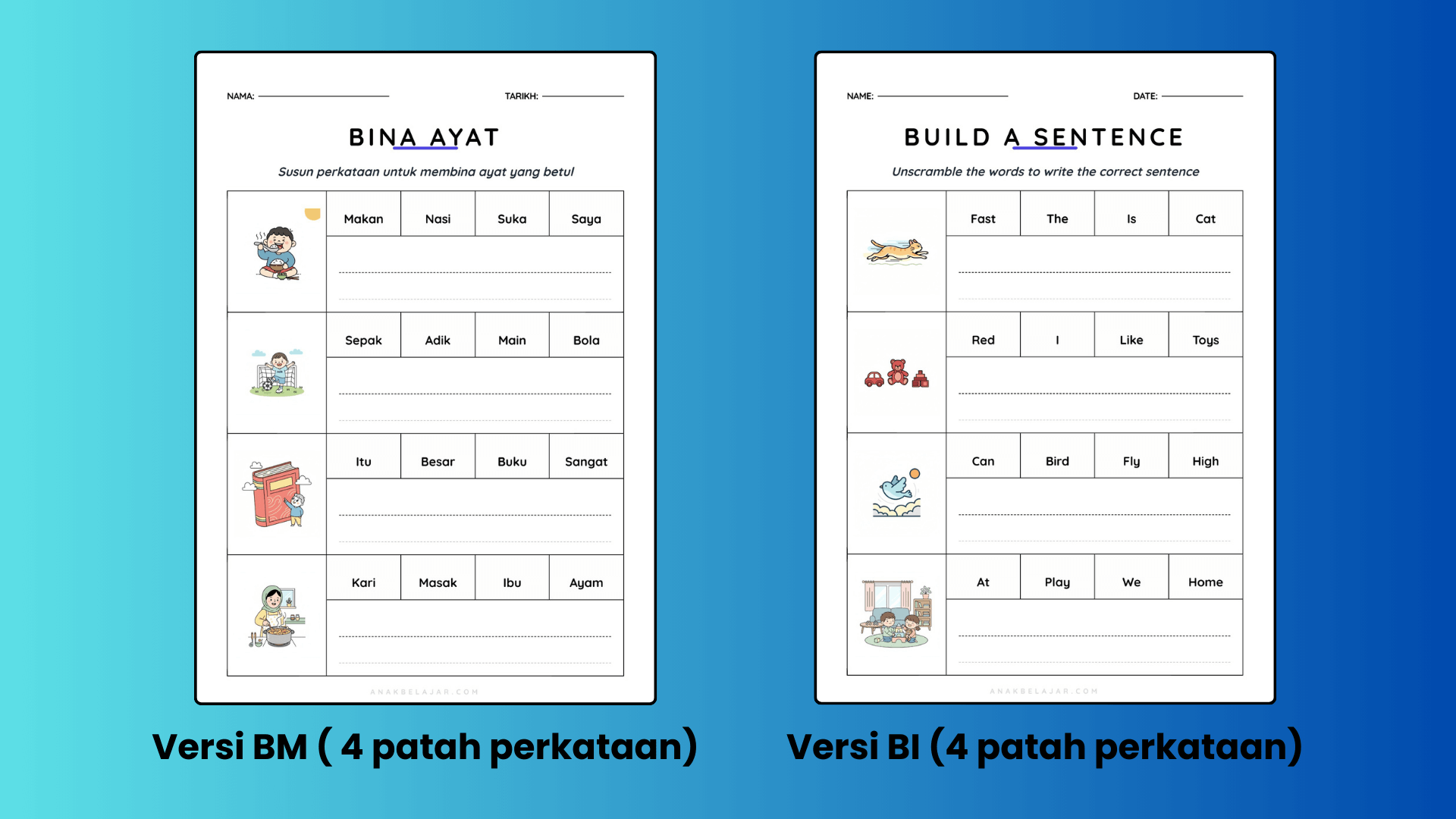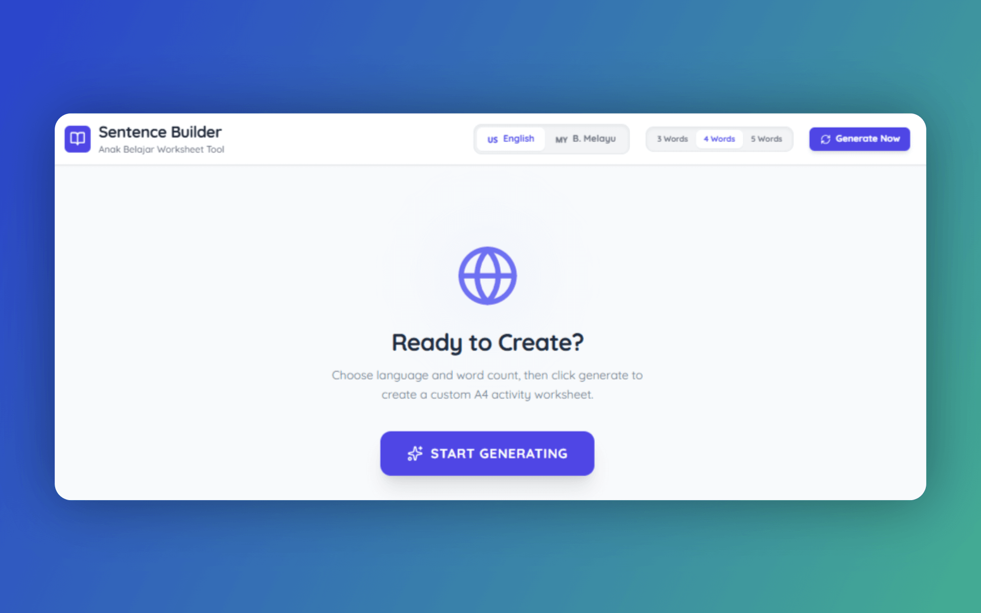Sentence Builder Worksheet Generator ialah aplikasi pendidikan yang direka khas untuk membantu pelajar membina ayat dengan lebih teratur, jelas dan berkesan. Aplikasi ini sangat sesuai digunakan oleh guru, ibu bapa, serta pelajar yang sedang mempelajari asas penulisan ayat dalam Bahasa Melayu atau Bahasa Inggeris.