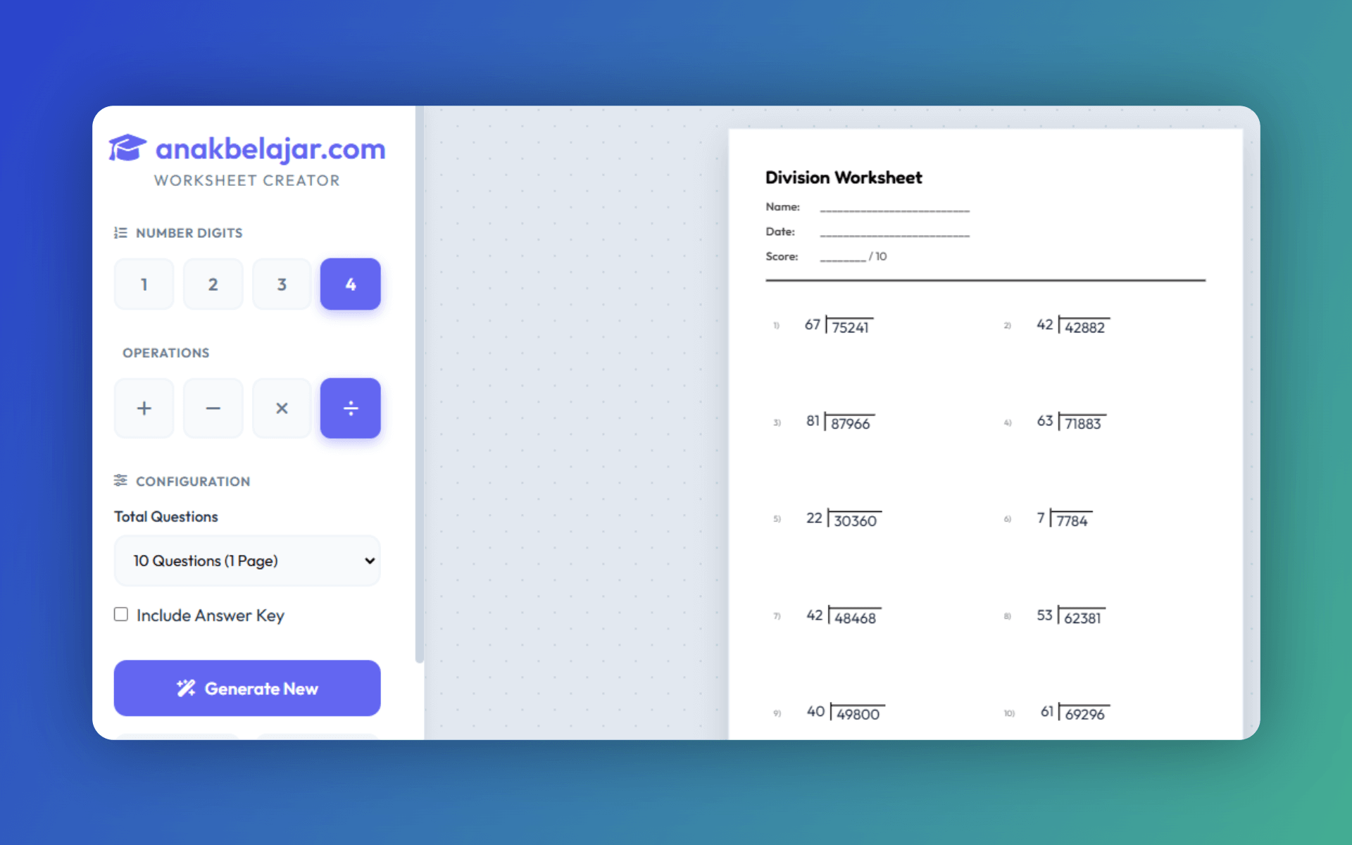 Aplikasi ini membolehkan pengguna menjana set soalan Matematik yang melibatkan operasi tambah, tolak, darab dan bahagi dengan pilihan digit 1 hingga 4 angka.